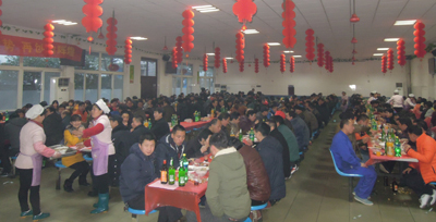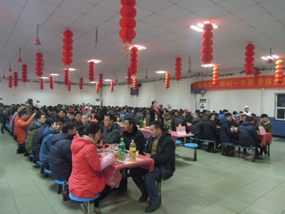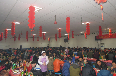 春節(jié)前夕,集團(tuán)公司行政、工會(huì)組織各事業(yè)部分工會(huì)對(duì)全體員工進(jìn)行摸底調(diào)查,最終確定留守杭州過(guò)年的有500多名外地單身員工,為了讓他們?cè)诤贾葸^(guò)一個(gè)歡樂(lè)、溫暖、祥和的新春,公司與往年一樣,為他們舉辦“同吃年夜飯,歡度除夕夜”活動(dòng)。為此,公司還在食堂掛起了大紅燈籠、彩帶等,增加了節(jié)日的喜慶氣氛。