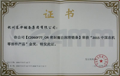 會上,與會人員主要圍繞會議主題進(jìn)行技術(shù)、市場、創(chuàng)新、發(fā)展等廣泛交流。會議期間,評比并頒發(fā)了2015中國農(nóng)機(jī)零部件46項(xiàng)金獎(jiǎng)產(chǎn)品和25項(xiàng)創(chuàng)新獎(jiǎng)產(chǎn)品。東華申報(bào)的C2060F77_OR和C2062H_ORSDF1密封圈鏈條經(jīng)久保田、福田雷沃等知名整機(jī)企業(yè)的推薦,專家委員會最終評審決定,對 東華申報(bào)的這兩款密封圈鏈條分別授予金獎(jiǎng)和創(chuàng)新獎(jiǎng)。這個(gè)獎(jiǎng)項(xiàng)是目前農(nóng)機(jī)鏈條企業(yè)的最高榮譽(yù),體現(xiàn)了東華農(nóng)機(jī)鏈條處于國內(nèi)同行領(lǐng)先水平,得到廣大農(nóng)業(yè)主機(jī)單位的贊譽(yù)和認(rèn)可。東華生產(chǎn)的農(nóng)機(jī)鏈條也暢銷國際市場,與CLASS、紐荷蘭等世界500強(qiáng)企業(yè)配套。