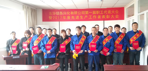 3月22日,在雄壯的國歌聲中,東華鏈條興化公司隆重召開第一屆職工(工會)代表大會暨2017年度先進表彰大會。集團副總經理袁立華、公司法定代表蔣錫林、公司工會主席汪昌宏、公司副總經理邱德方、劉冬根、傳動鏈事業(yè)部總經理楊小勇及其他中層、各分工會主席、各崗位標兵、先進代表、職工(工會)代表等60余人參加大會。