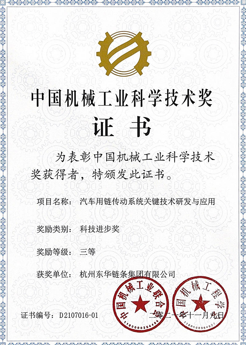 日前,東華為主承擔、武漢某公司參與研發的“汽車用鏈傳動系統關鍵技術研發及應用”高端鏈傳動系統研發項目獲2021年度中國機械工業科學技術獎科技進步獎三等獎,東華是全國鏈傳動行業中唯一獲得2021年度中國機械工業科技大獎的企業。