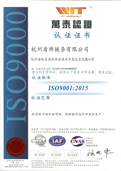 2015版本質量、環境管理體系認證為當前國際標準最新版認證。盾牌公司順利通過認證,代表著公司在標準滾子鏈和套筒鏈、特種鏈的設計開發和生產及其所涉及的環境管理在管理體系上走在了同行的前列,為進一步提升客戶服務、樹立品牌形象提供了更加有力的支撐。