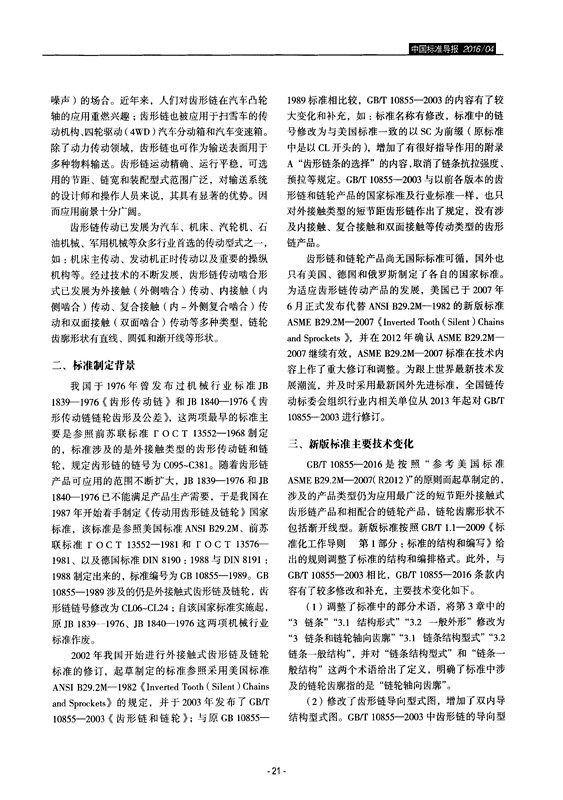 由杭州東華鏈條集團(tuán)有限公司主持修訂的GB/T 10855—2016《齒形鏈和鏈輪》新版國(guó)家標(biāo)準(zhǔn),自2016年9月1日起實(shí)施;這是中國(guó)鏈傳動(dòng)領(lǐng)域近期新發(fā)布的一項(xiàng)重要標(biāo)準(zhǔn)。為更好地宣貫好這項(xiàng)新標(biāo)準(zhǔn),應(yīng)《中國(guó)標(biāo)準(zhǔn)導(dǎo)報(bào)》雜志社的約稿要求,東華集團(tuán)技術(shù)中心技術(shù)標(biāo)準(zhǔn)化人員撰寫了《新版鏈傳動(dòng)領(lǐng)域重要產(chǎn)品標(biāo)準(zhǔn)GB/T 10855—2016〈齒形鏈和鏈輪〉主要技術(shù)變化解讀》這篇標(biāo)準(zhǔn)解讀論文,已刊登在《中國(guó)標(biāo)準(zhǔn)導(dǎo)報(bào)》2016年第4期上。下面將這篇論文轉(zhuǎn)載如下: